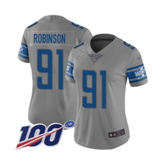 >Women's Detroit Lions #91 A'Shawn Robinson Limited Gray Inverted Legend 100th Season Football Jersey