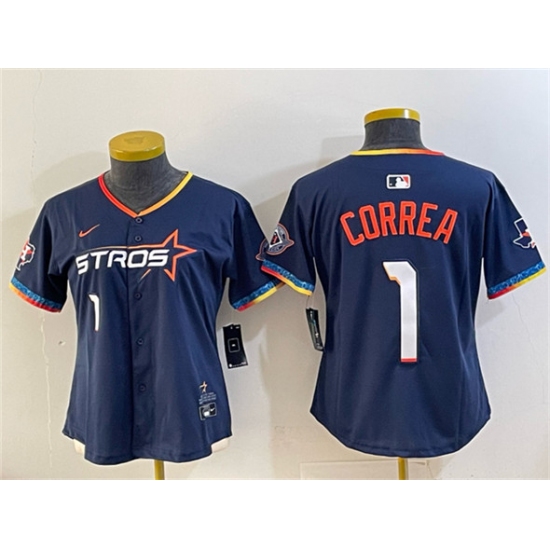 >Women's Houston Astros #1 Carlos Correa Navy 2025 City Connect With Texas Patch Limited Stitched Baseball Jersey(Run Small)