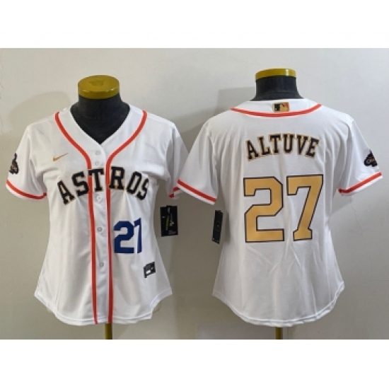 >Women's Houston Astros #27 Jose Altuve Number 2023 White Gold World Serise Champions Cool Base Stitched Jersey1
