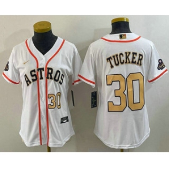 >Women's Houston Astros #30 Kyle Tucker Number 2023 White Gold World Serise Champions Cool Base Stitched Jerseys
