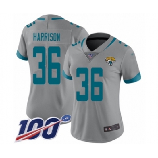 >Women's Jacksonville Jaguars #36 Ronnie Harrison Silver Inverted Legend Limited 100th Season Football Jersey