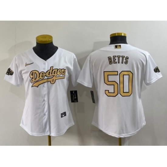 >Women's Los Angeles Dodgers #50 Mookie Betts White 2022 All Star Stitched Cool Base Nike Jersey