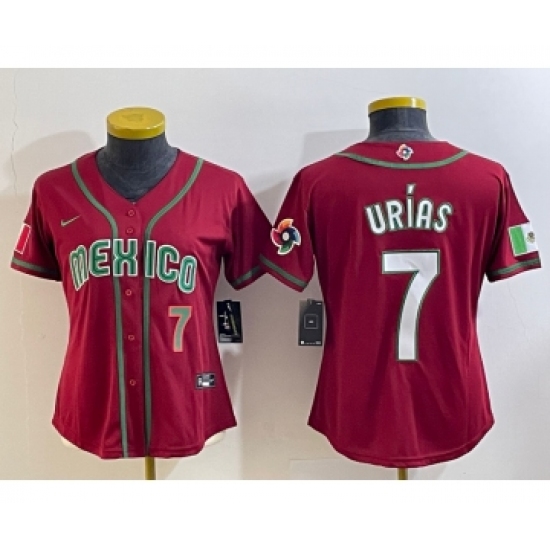 >Women's Mexico Baseball #7 Julio Urias Number 2023 Red World Baseball Classic Stitched Jersey