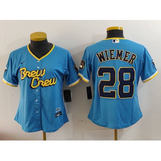 Women's Milwaukee Brewers #28 Joey Wiemer Blue 2022 City Connect Cool Base Stitched Jersey