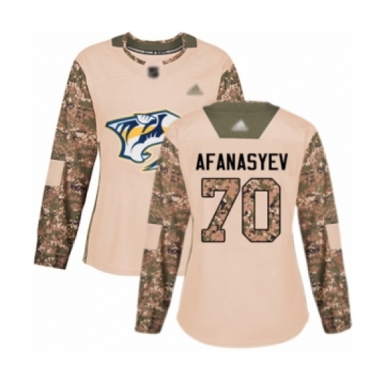 >Women's Nashville Predators #70 Egor Afanasyev Authentic Camo Veterans Day Practice Hockey Jersey