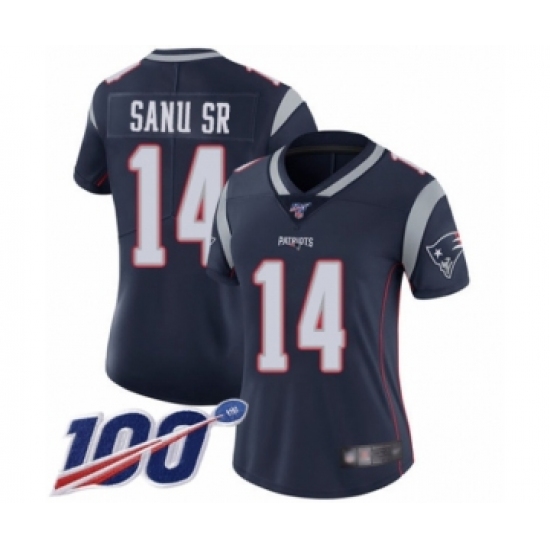 >Women's New England Patriots #14 Mohamed Sanu Sr Navy Blue Team Color Vapor Untouchable Limited Player 100th Season Football Jersey
