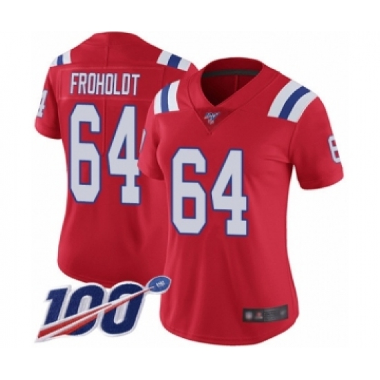 >Women's New England Patriots #64 Hjalte Froholdt Red Alternate Vapor Untouchable Limited Player 100th Season Football Jersey