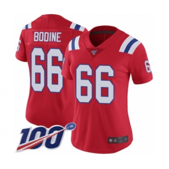 >Women's New England Patriots #66 Russell Bodine Red Alternate Vapor Untouchable Limited Player 100th Season Football Jersey