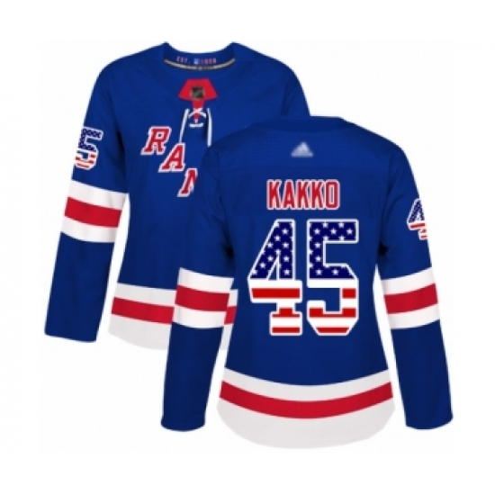 >Women's New York Rangers #45 Kaapo Kakko Authentic Royal Blue USA Flag Fashion Hockey Jersey