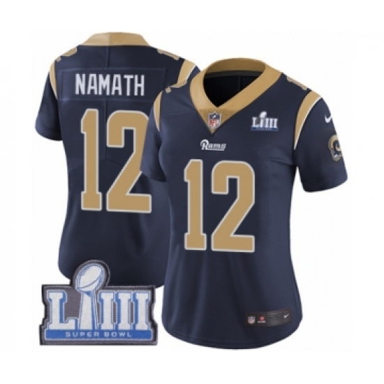 Women's Nike Los Angeles Rams #12 Joe Namath Navy Blue Team Color Vapor Untouchable Limited Player Super Bowl LIII Bound NFL Jersey