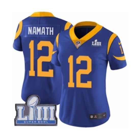 >Women's Nike Los Angeles Rams #12 Joe Namath Royal Blue Alternate Vapor Untouchable Limited Player Super Bowl LIII Bound NFL Jersey