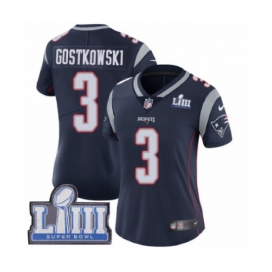 >Women's Nike New England Patriots #3 Stephen Gostkowski Navy Blue Team Color Vapor Untouchable Limited Player Super Bowl LIII Bound NFL Jersey