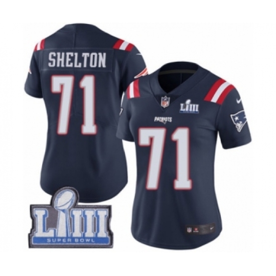 >Women's Nike New England Patriots #71 Danny Shelton Limited Navy Blue Rush Vapor Untouchable Super Bowl LIII Bound NFL Jersey