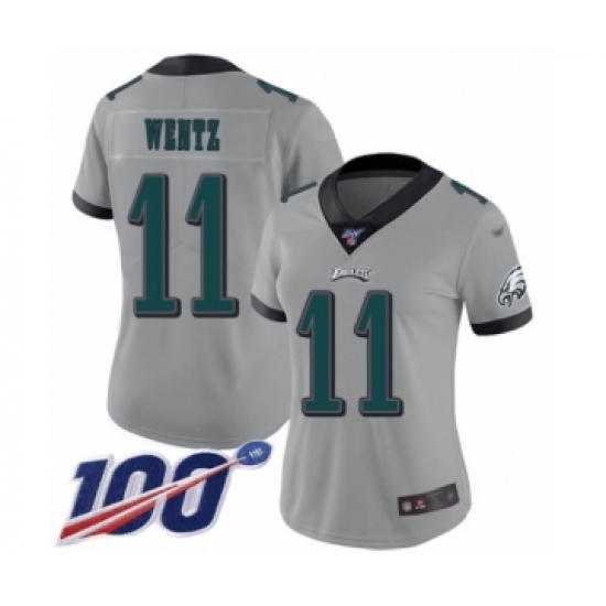 >Women's Philadelphia Eagles #11 Carson Wentz Limited Silver Inverted Legend 100th Season Football Jersey