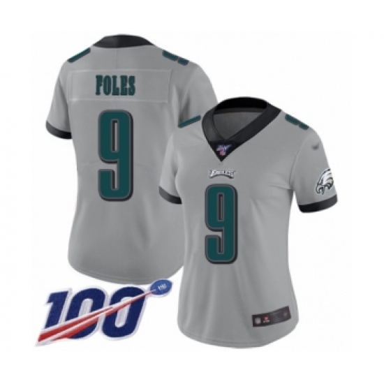 >Women's Philadelphia Eagles #9 Nick Foles Limited Silver Inverted Legend 100th Season Football Jersey