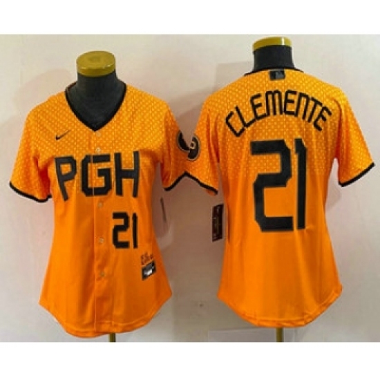Women's Pittsburgh Pirates #21 Roberto Clemente Number Yellow 2023 City Connect Stitched Jersey