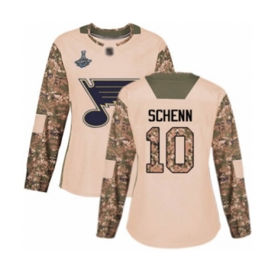 >Women's St. Louis Blues #10 Brayden Schenn Authentic Camo Veterans Day Practice 2019 Stanley Cup Champions Hockey Jersey