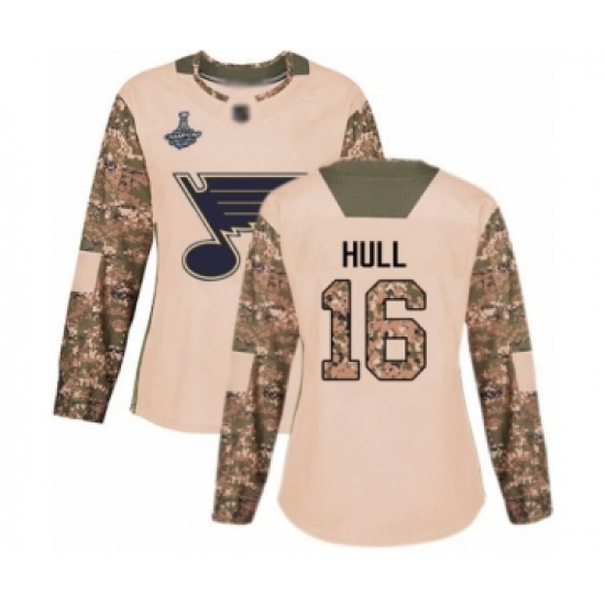 Women's St. Louis Blues #16 Brett Hull Authentic Camo Veterans Day Practice 2019 Stanley Cup Champions Hockey Jersey
