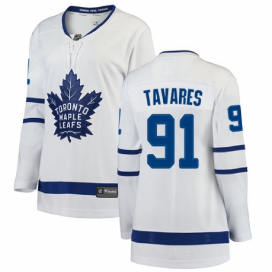 >Women's Toronto Maple Leafs #91 John Tavares Authentic White Away Fanatics Branded Breakaway NHL Jersey