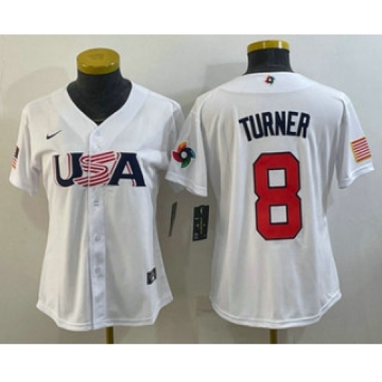 Women's USA Baseball #8 Trea Turner 2023 White World Classic Stitched Jerseys