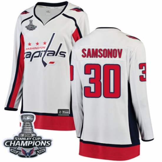>Women's Washington Capitals #30 Ilya Samsonov Fanatics Branded White Away Breakaway 2018 Stanley Cup Final Champions NHL Jersey