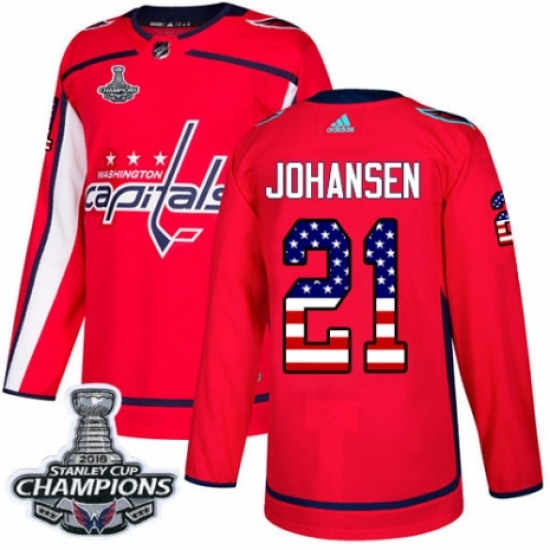 Women's Adidas Washington Capitals #21 Lucas Johansen Authentic Red USA Flag Fashion 2018 Stanley Cup Final Champions NHL Jersey