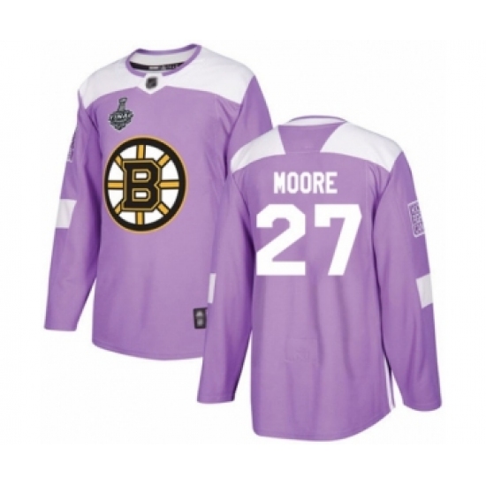 >Youth Boston Bruins #27 John Moore Authentic Purple Fights Cancer Practice 2019 Stanley Cup Final Bound Hockey Jersey