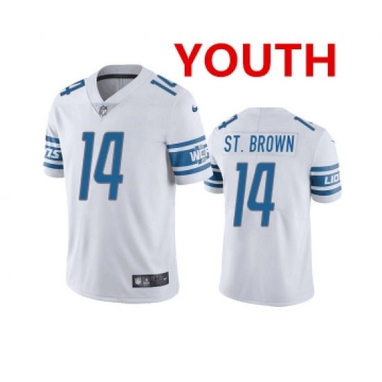>Youth Detroit Lions #14 mon-Ra St. Brown White Vapor Untouchable Limited Stitched Jersey