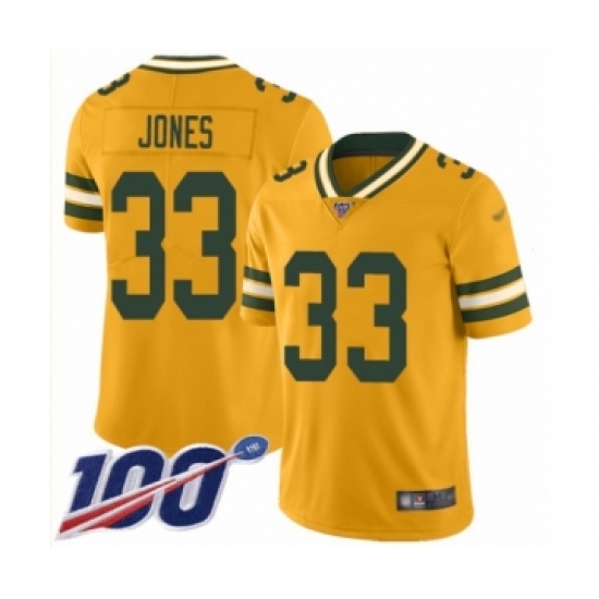 >Youth Green Bay Packers #33 Aaron Jones Limited Gold Inverted Legend 100th Season Football Jersey