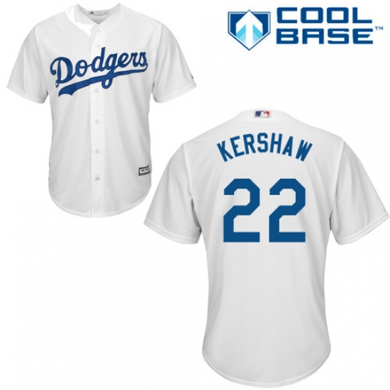 Home>MLB>Los Angeles Dodgers>Clayton Kershaw>Youth Majestic Los Angeles Dodgers #22 Clayton Kershaw Replica White Home Cool Base MLB Jersey