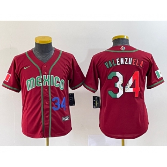 >Youth Mexico Baseball #34 Fernando Valenzuela 2023 Red World Classic Stitched Jersey1