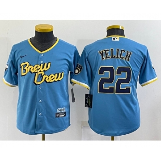 >Youth Milwaukee Brewers #22 Christian Yelich Blue 2022 City Connect Cool Base Stitched Jersey