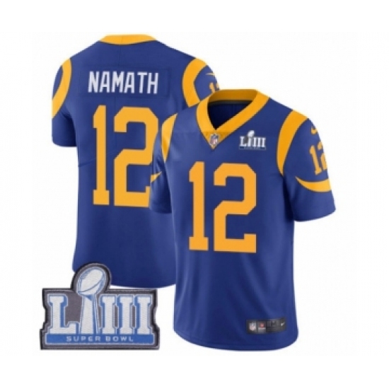 >Youth Nike Los Angeles Rams #12 Joe Namath Royal Blue Alternate Vapor Untouchable Limited Player Super Bowl LIII Bound NFL Jersey