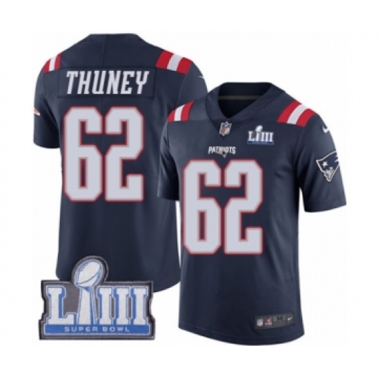 >Youth Nike New England Patriots #62 Joe Thuney Limited Navy Blue Rush Vapor Untouchable Super Bowl LIII Bound NFL Jersey