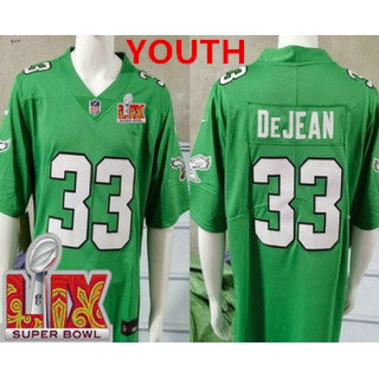 Youth Philadelphia Eagles #33 Cooper DeJean Limited Kelly Green Super Bowl LIX Vapor Jersey
