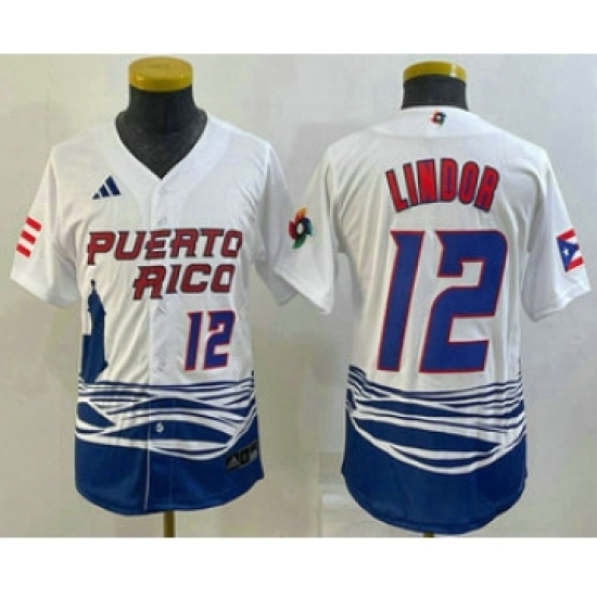 Youth Puerto Rico Baseball #12 Francisco Lindor Number 2023 White World Baseball Classic Stitched Jerseys