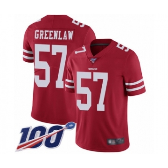 >Youth San Francisco 49ers #57 Dre Greenlaw Red Team Color Vapor Untouchable Limited Player 100th Season Football Jersey