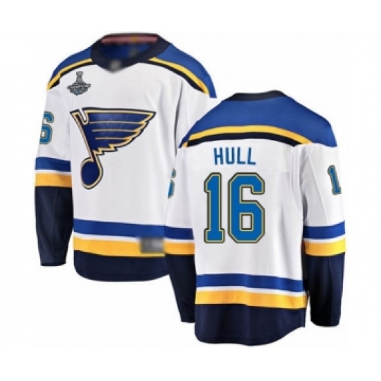 >Youth St. Louis Blues #16 Brett Hull Fanatics Branded White Away Breakaway 2019 Stanley Cup Champions Hockey Jersey