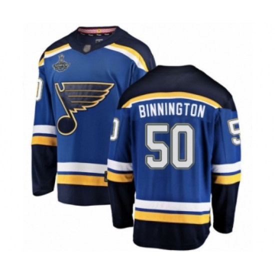 >Youth St. Louis Blues #50 Jordan Binnington Fanatics Branded Royal Blue Home Breakaway 2019 Stanley Cup Champions Hockey Jersey