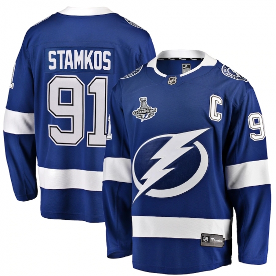 >Youth Tampa Bay Lightning #91 Steven Stamkos Fanatics Branded Blue Home 2020 Stanley Cup Champions Breakaway Jersey