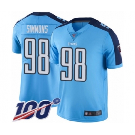 >Youth Tennessee Titans #98 Jeffery Simmons Limited Light Blue Rush Vapor Untouchable 100th Season Football Jersey
