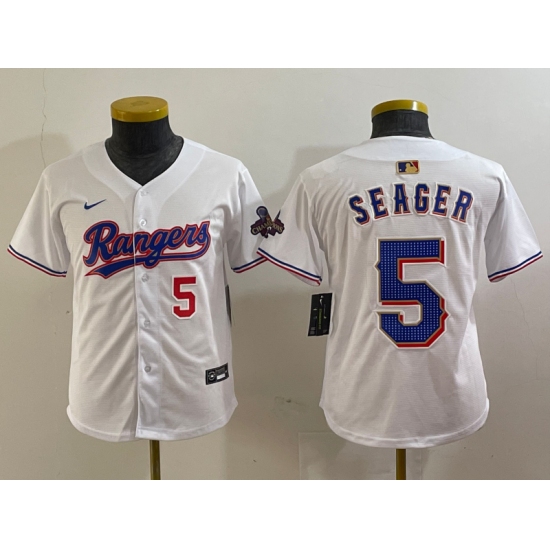 >Youth Texas Rangers #5 Corey Seager Number White 2024 Gold Collection Limited Cool Base Jerseys
